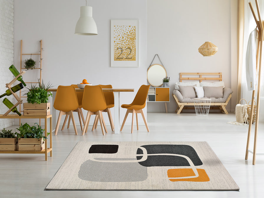 Teppe i moderne design. Det har en myk og behagelig luv, og det moderne mĂžnsteret gir stil og eleganse til rommet der det legges.