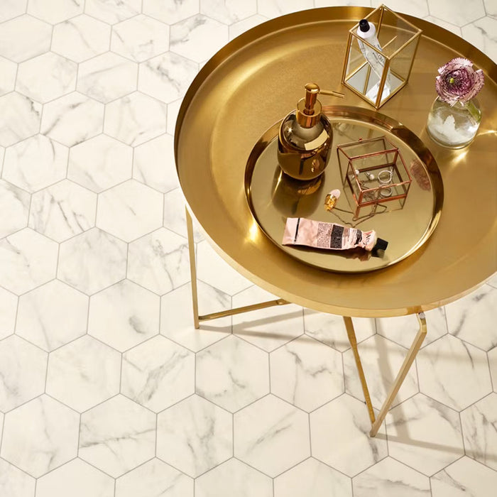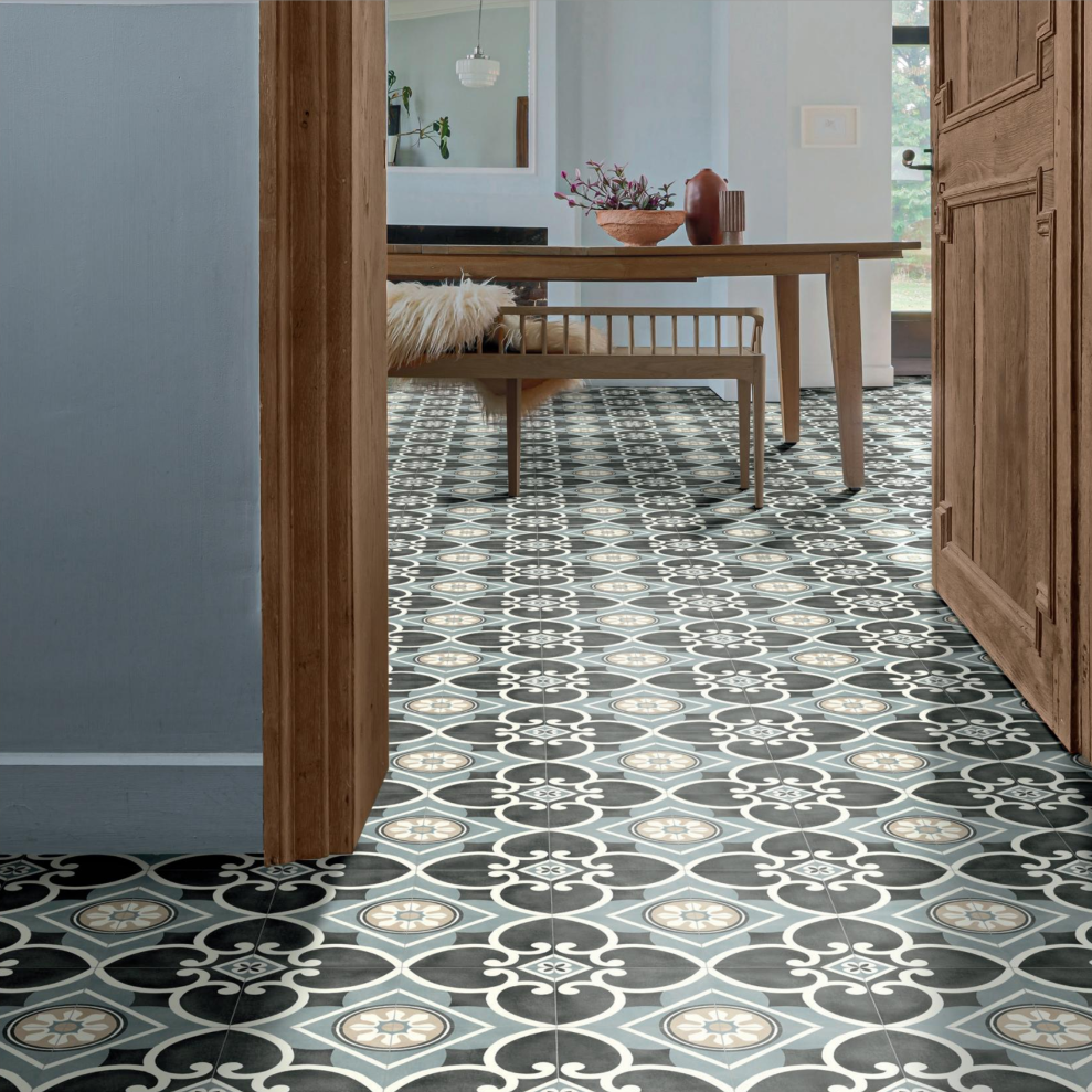 Vinylgulv av hÞy kvalitet i et stilfullt designet mÞnster. Du fÄr ogsÄ et rengjÞringsvennlig, sklisikkert og lydabsorberende gulv.