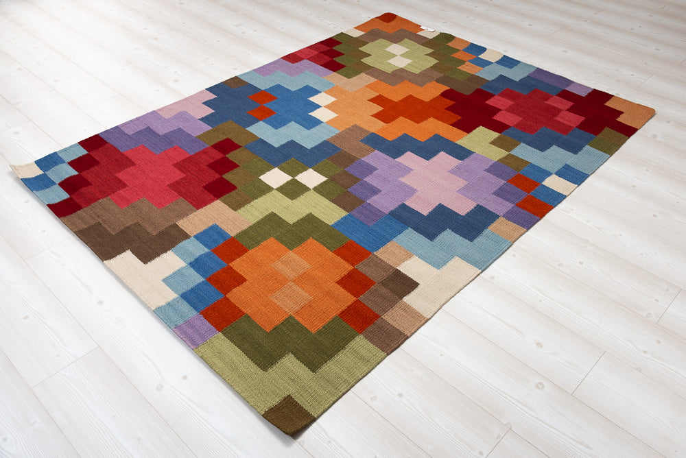 Ullteppe med tÞff design. Spring er hÄndvevet i 100% ull, noe som gir det holdbare, myke og smussavstÞtende egenskaper. Teppet kan ogsÄ vendes siden det er solid vevd tvers gjennom. Dette teppet liver virkelig opp rommet ditt med sitt tÞffe mÞnster og klare farger.br />