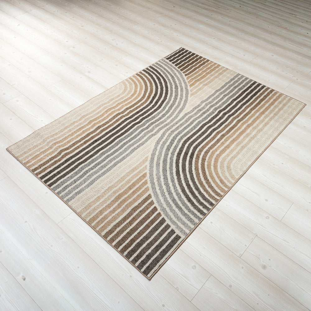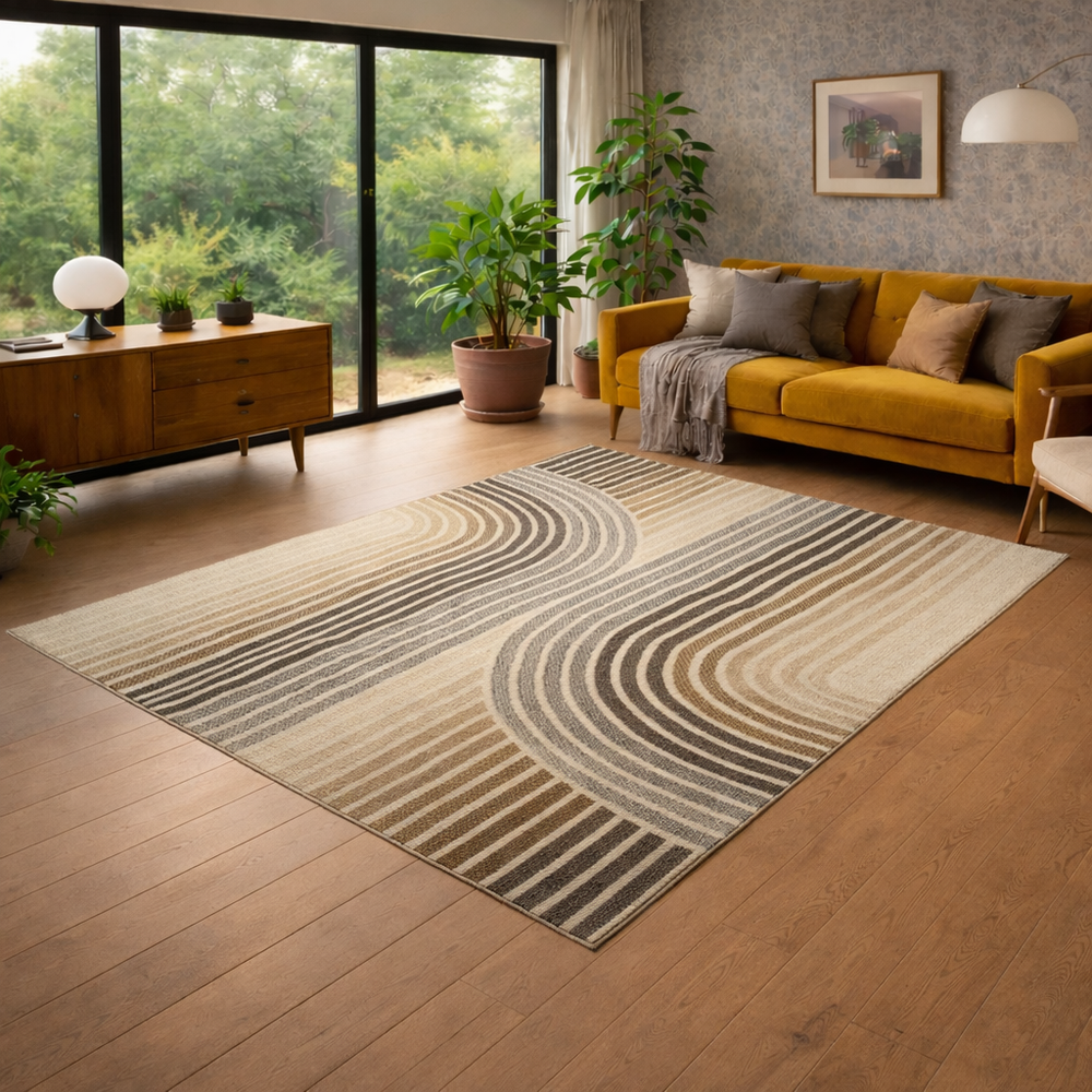 Dette teppet kombinerer leken retrodesign med moderne linjer og skaper et uttrykk som fÞles bÄde trendy og tidlÞst. De buede formene gir rommet liv og bevegelse, mens de harmoniske fargetonene gjÞr det enkelt Ä kombinere med ulike interiÞrstiler.